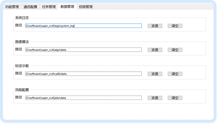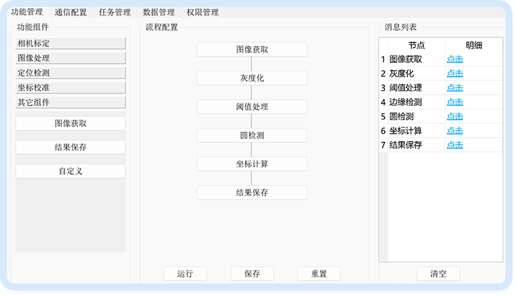 通过运行和报错信息为依据进行图像数据处理包,相机标定(九点标定、旋转标定)数据对需要保存的数据路径进行指定,以及是否清除指定路径下过去的历史数据