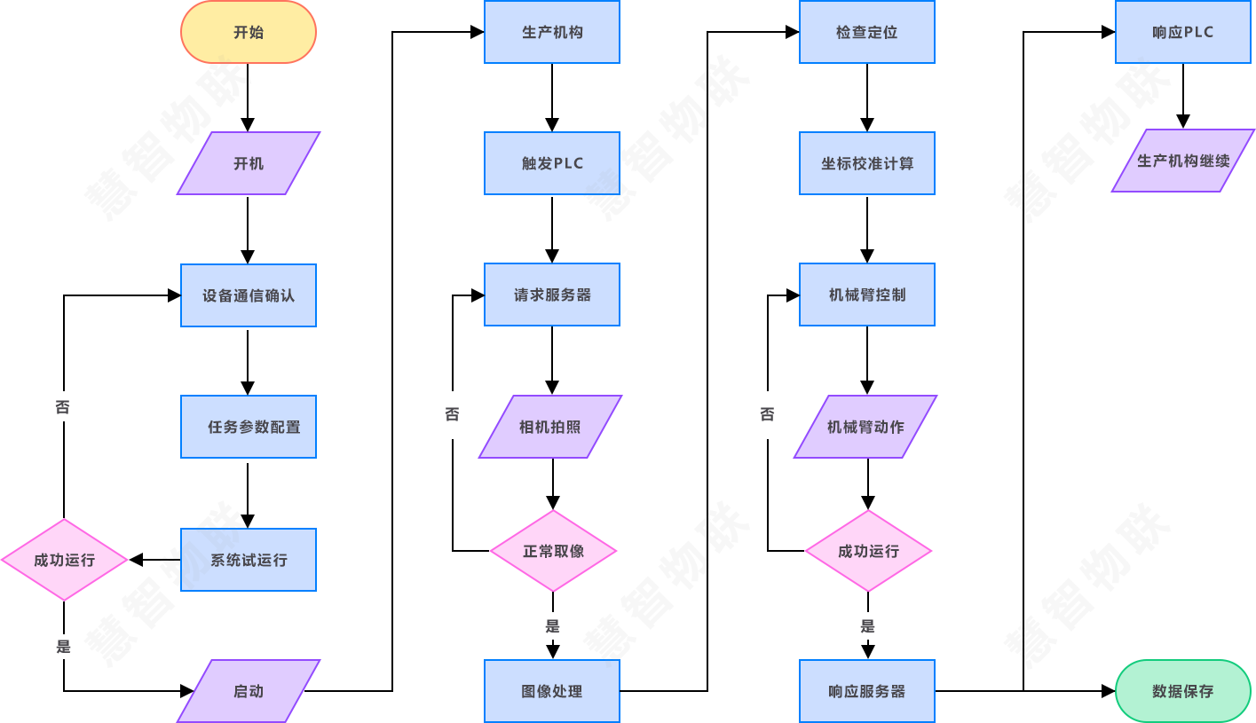 下图是产品作用于生产的流程图,成功运行后触发PLC,请求软件进行处理,经过图像处理、检测定位、坐标校准计算后控制机械臂运动,实现对目标产品的高精度对位,然后自动化的完成多阶段工业生产任务